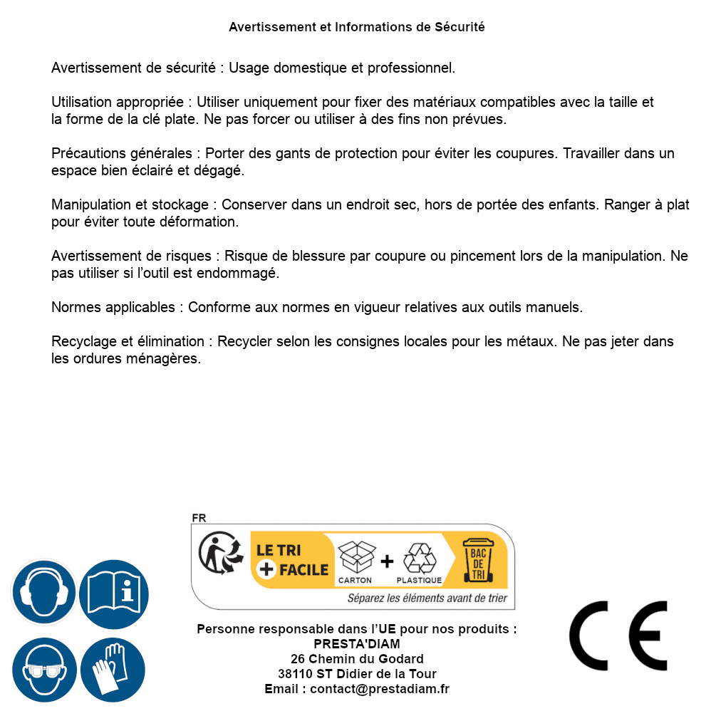 | ADVERTENCIA y SEGURIDAD | Identification de la personne responsable dans l’UE : Nom : PRESTA'DIAM. Adresse : 26 Chemin du Godard, 38110 ST Didier de la Tour (France). Email : contact@prestadiam.fr. |