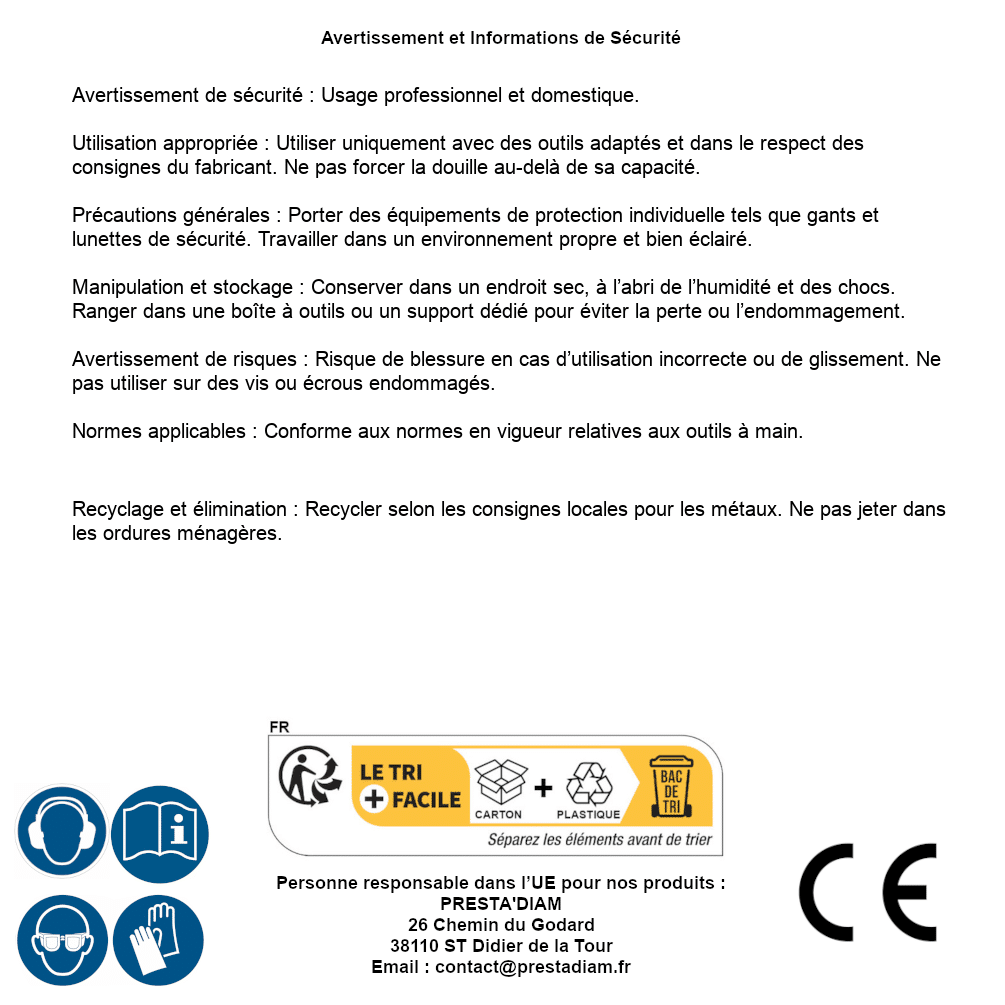 | ADVERTENCIA y SEGURIDAD | Identification de la personne responsable dans l’UE : Nom : PRESTA'DIAM. Adresse : 26 Chemin du Godard, 38110 ST Didier de la Tour (France). Email : contact@prestadiam.fr. |