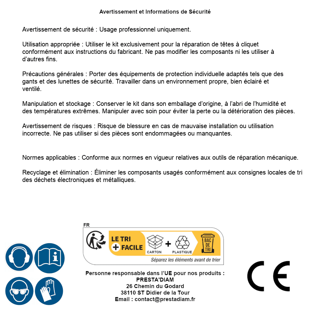 | ADVERTENCIA y SEGURIDAD | Identification de la personne responsable dans l’UE : Nom : PRESTA'DIAM. Adresse : 26 Chemin du Godard, 38110 ST Didier de la Tour (France). Email : contact@prestadiam.fr. |
