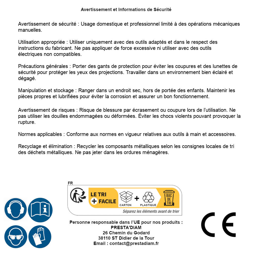 | ADVERTENCIA y SEGURIDAD | Identification de la personne responsable dans l’UE : Nom : PRESTA'DIAM. Adresse : 26 Chemin du Godard, 38110 ST Didier de la Tour (France). Email : contact@prestadiam.fr. |