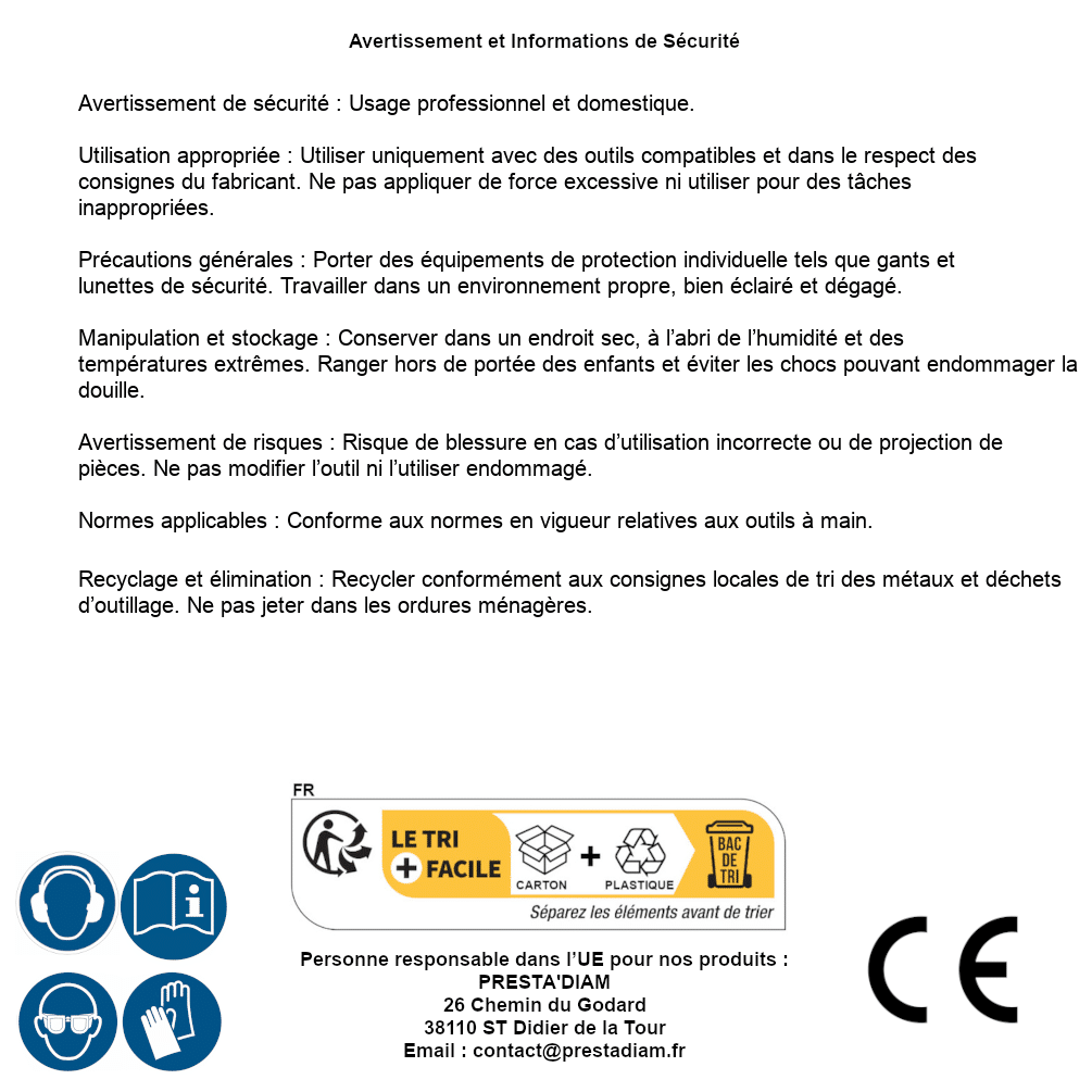 | ADVERTENCIA y SEGURIDAD | Identification de la personne responsable dans l’UE : Nom : PRESTA'DIAM. Adresse : 26 Chemin du Godard, 38110 ST Didier de la Tour (France). Email : contact@prestadiam.fr. |