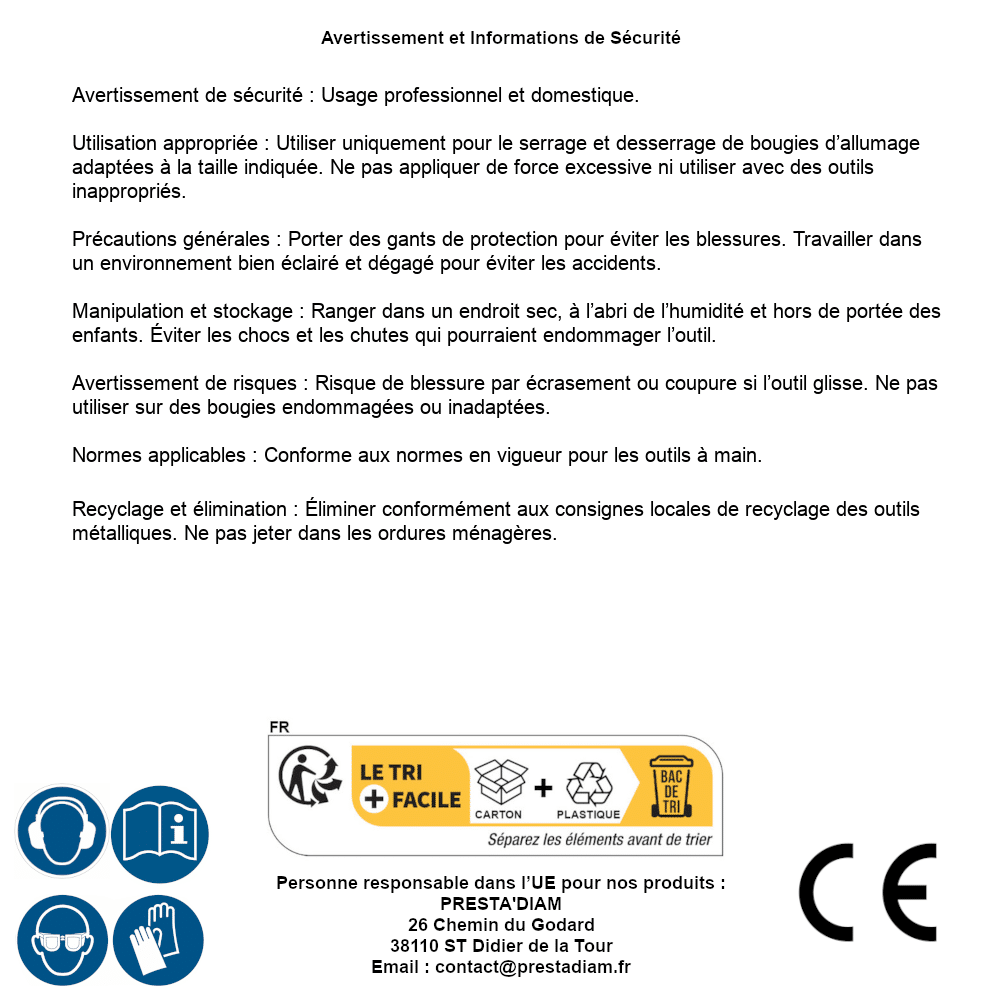 | ADVERTENCIA y SEGURIDAD | Identification de la personne responsable dans l’UE : Nom : PRESTA'DIAM. Adresse : 26 Chemin du Godard, 38110 ST Didier de la Tour (France). Email : contact@prestadiam.fr. |