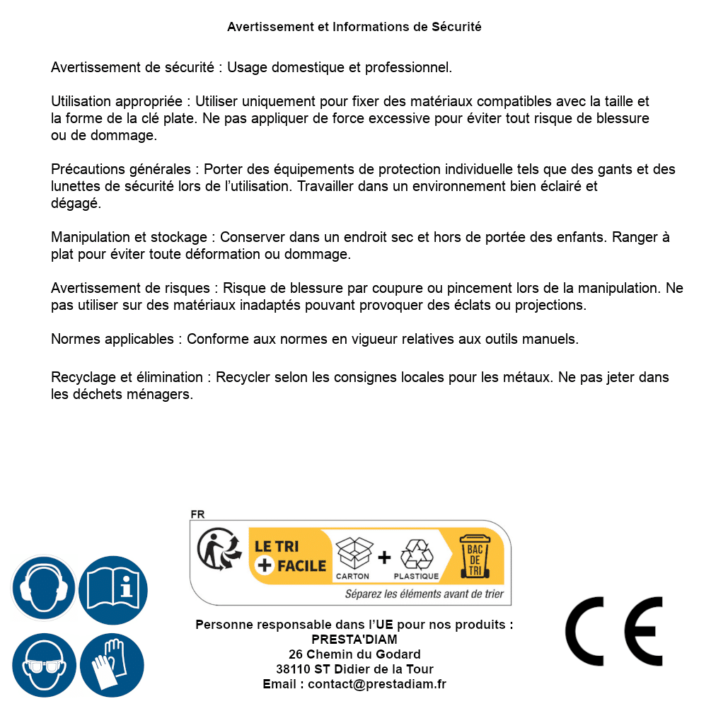 | ADVERTENCIA y SEGURIDAD | Identification de la personne responsable dans l’UE : Nom : PRESTA'DIAM. Adresse : 26 Chemin du Godard, 38110 ST Didier de la Tour (France). Email : contact@prestadiam.fr. |
