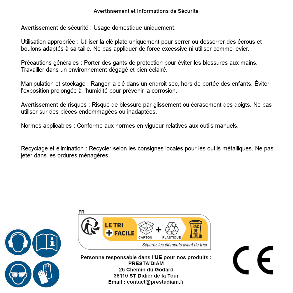 | ADVERTENCIA y SEGURIDAD | Identification de la personne responsable dans l’UE : Nom : PRESTA'DIAM. Adresse : 26 Chemin du Godard, 38110 ST Didier de la Tour (France). Email : contact@prestadiam.fr. |