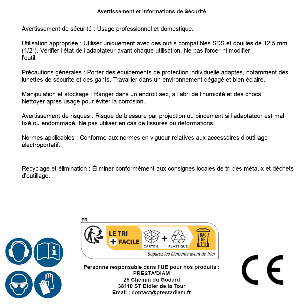 | ADVERTENCIA y SEGURIDAD | Identification de la personne responsable dans l’UE : Nom : PRESTA'DIAM. Adresse : 26 Chemin du Godard, 38110 ST Didier de la Tour (France). Email : contact@prestadiam.fr. |