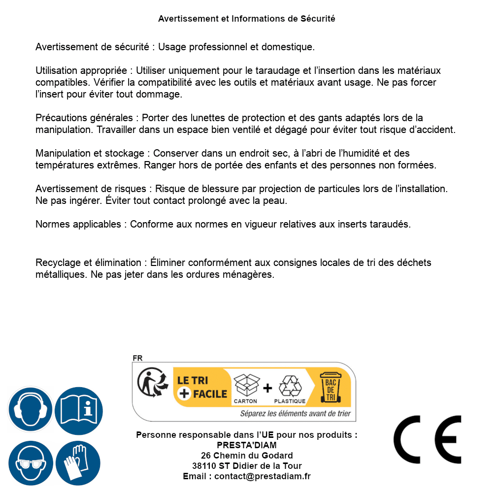 | ADVERTENCIA y SEGURIDAD | Identification de la personne responsable dans l’UE : Nom : PRESTA'DIAM. Adresse : 26 Chemin du Godard, 38110 ST Didier de la Tour (France). Email : contact@prestadiam.fr. |