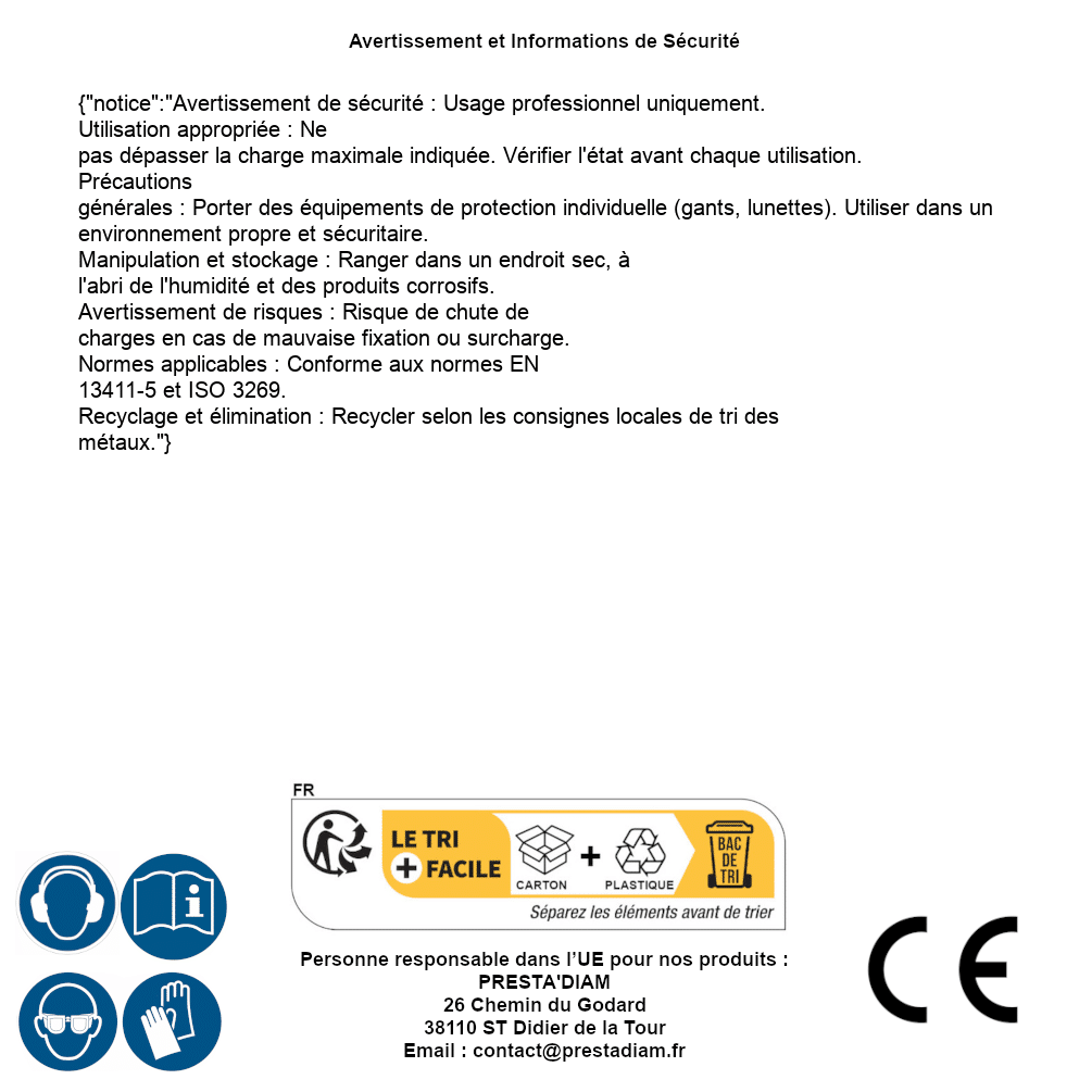 | Persona responsable UE | PRESTA'DIAM 26 Chemin du Godard 38110 ST Didier de la Tour Correo electrónico : contact@prestadiam.fr |