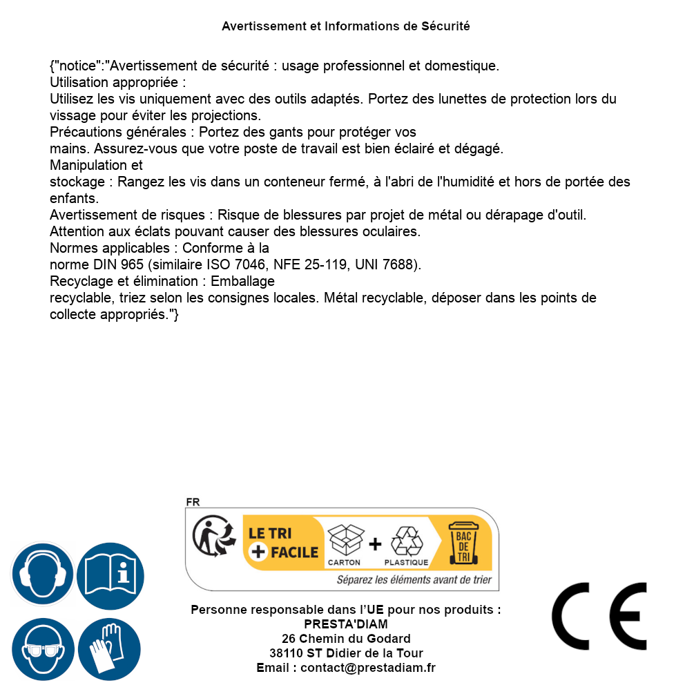 | ADVERTENCIA y SEGURIDAD | Identification de la personne responsable dans l’UE : Nom : PRESTA'DIAM. Adresse : 26 Chemin du Godard, 38110 ST Didier de la Tour (France). Email : contact@prestadiam.fr. |