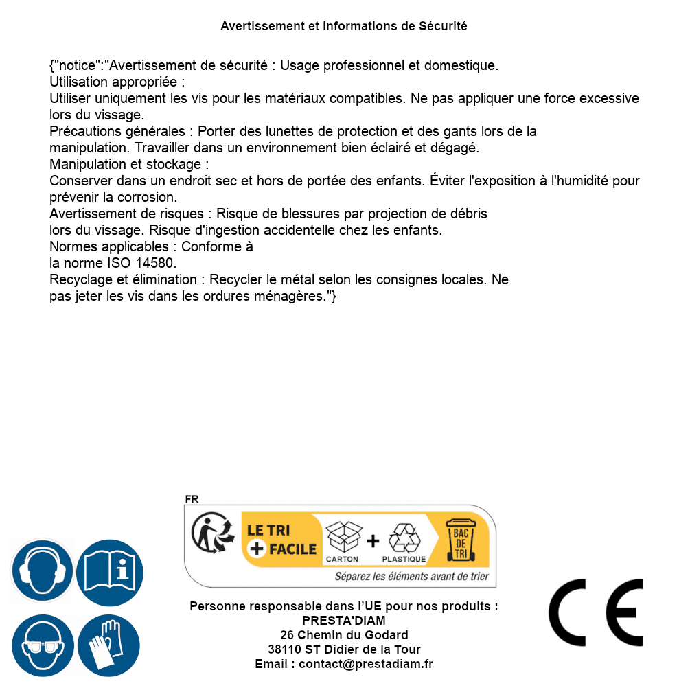 | ADVERTENCIA y SEGURIDAD | Identification de la personne responsable dans l’UE : Nom : PRESTA'DIAM. Adresse : 26 Chemin du Godard, 38110 ST Didier de la Tour (France). Email : contact@prestadiam.fr. |