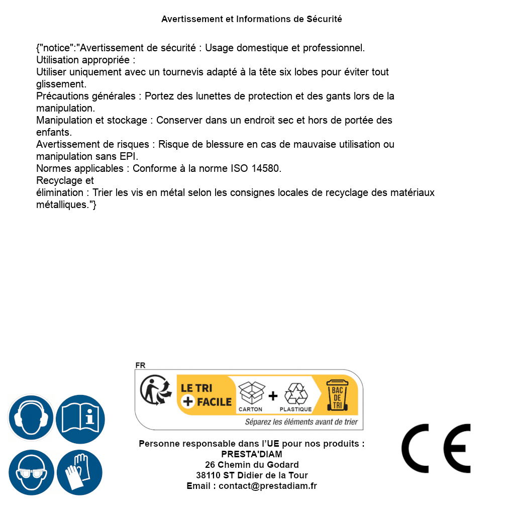 | ADVERTENCIA y SEGURIDAD | Identification de la personne responsable dans l’UE : Nom : PRESTA'DIAM. Adresse : 26 Chemin du Godard, 38110 ST Didier de la Tour (France). Email : contact@prestadiam.fr. |