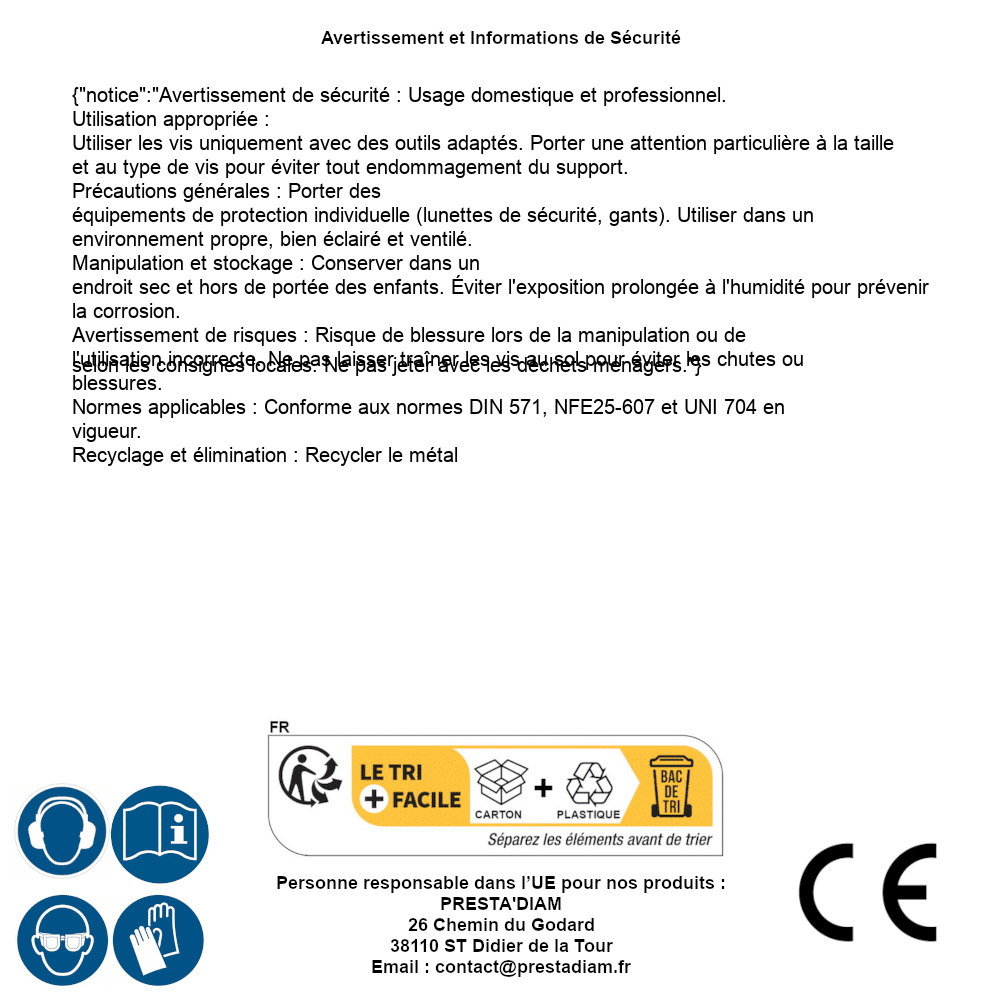 | ADVERTENCIA y SEGURIDAD | Identification de la personne responsable dans l’UE : Nom : PRESTA'DIAM. Adresse : 26 Chemin du Godard, 38110 ST Didier de la Tour (France). Email : contact@prestadiam.fr. |