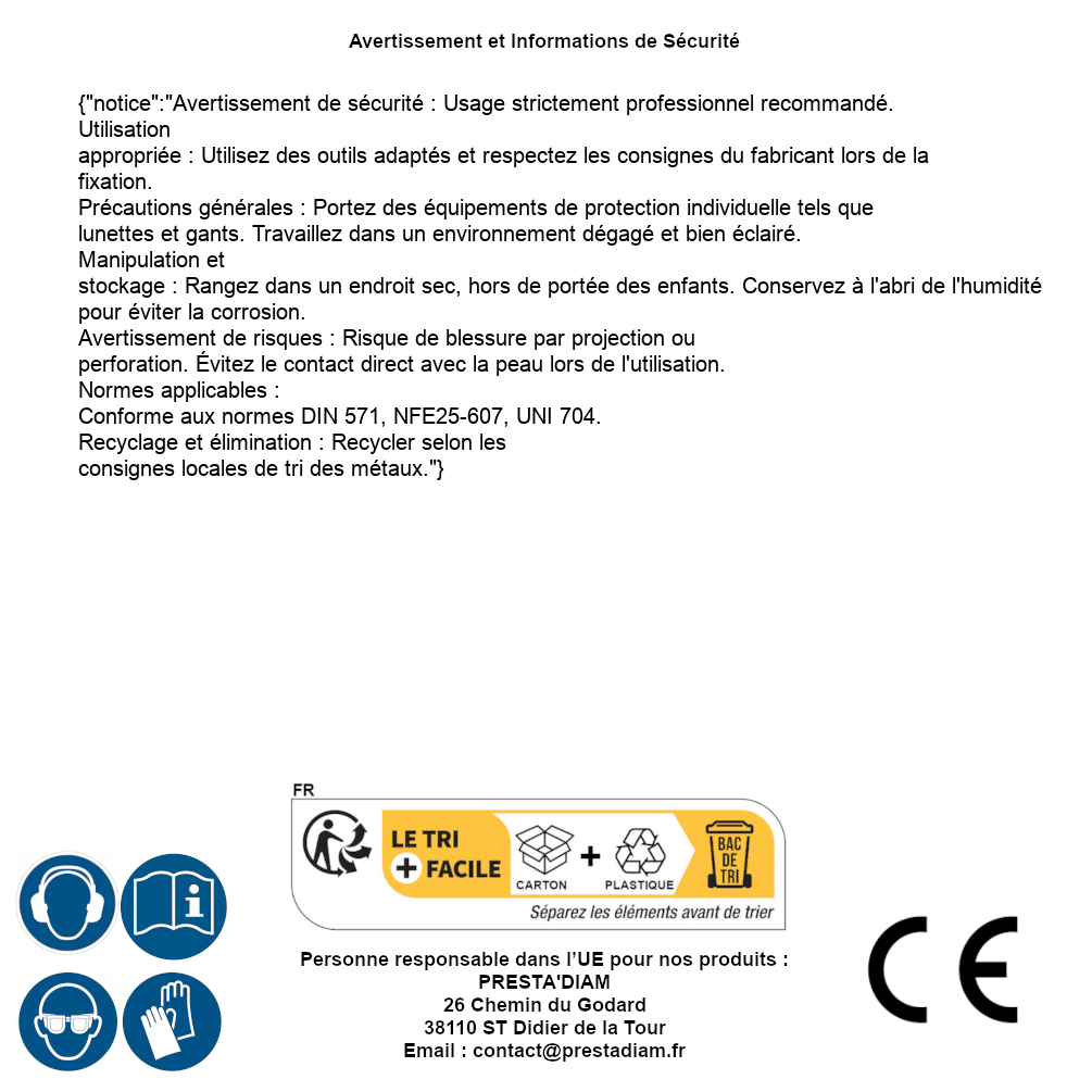 | Persona responsable UE | PRESTA'DIAM 26 Chemin du Godard 38110 ST Didier de la Tour Correo electrónico : contact@prestadiam.fr |