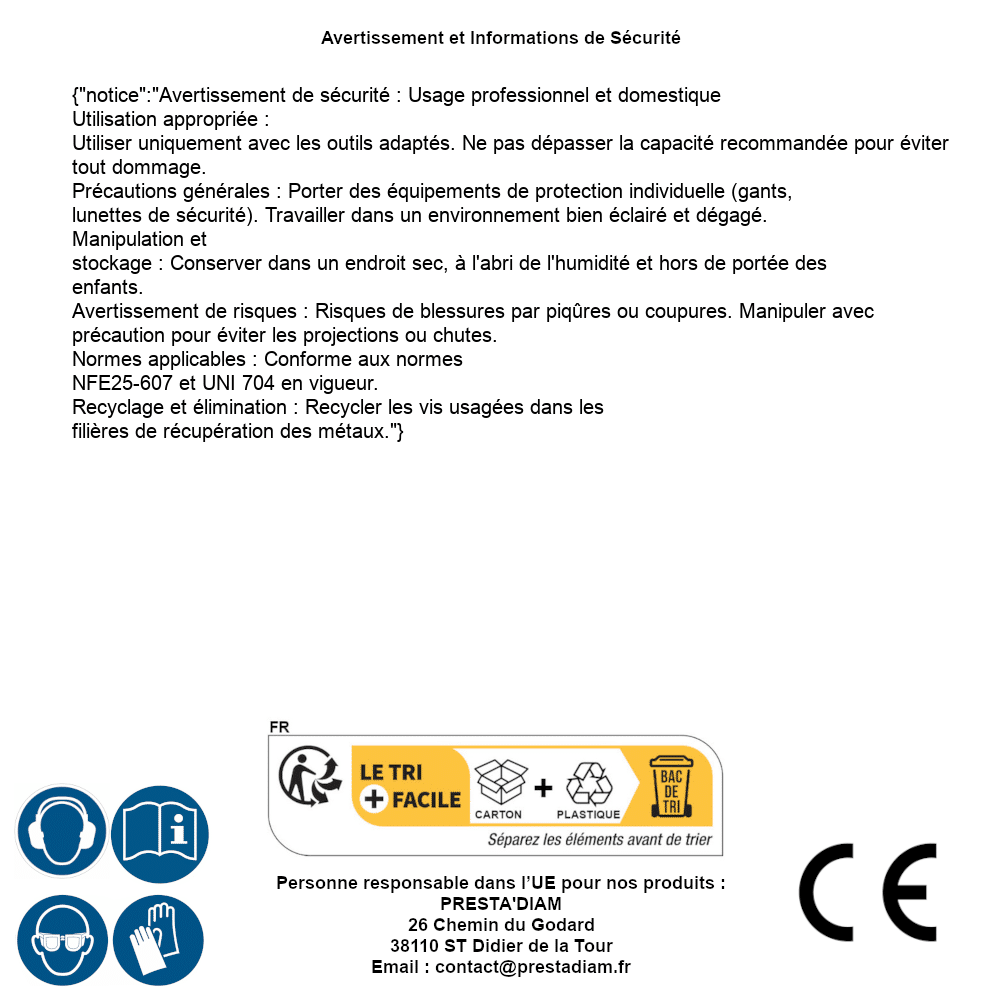 | ADVERTENCIA y SEGURIDAD | Identification de la personne responsable dans l’UE : Nom : PRESTA'DIAM. Adresse : 26 Chemin du Godard, 38110 ST Didier de la Tour (France). Email : contact@prestadiam.fr. |