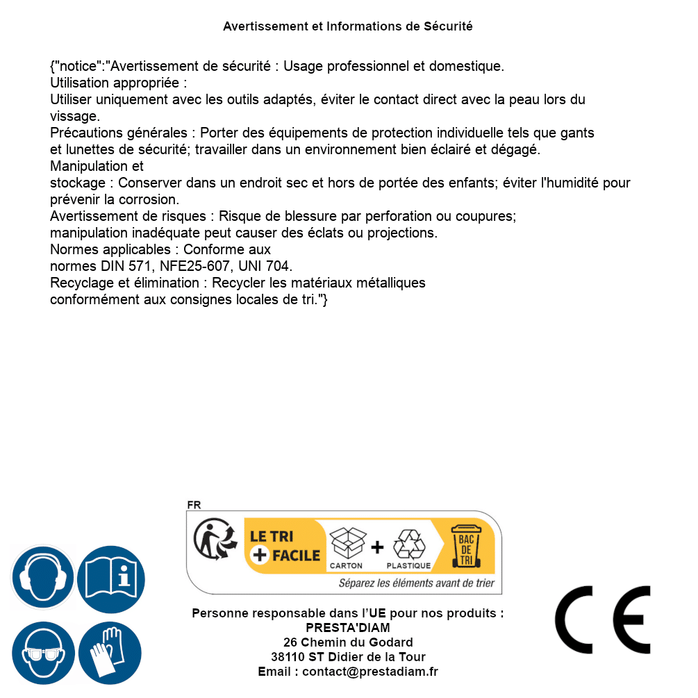 | Persona responsable UE | PRESTA'DIAM 26 Chemin du Godard 38110 ST Didier de la Tour Correo electrónico : contact@prestadiam.fr |