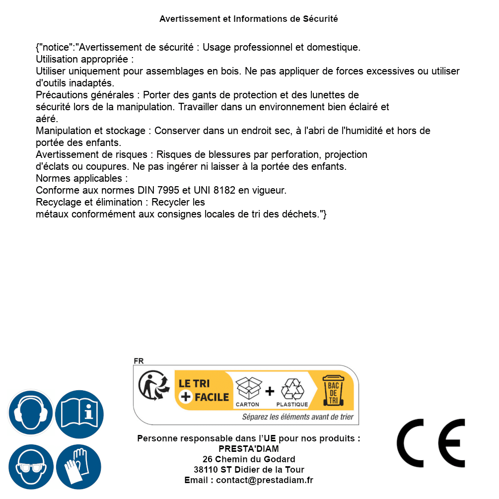 | Persona responsable UE | PRESTA'DIAM 26 Chemin du Godard 38110 ST Didier de la Tour Correo electrónico : contact@prestadiam.fr |