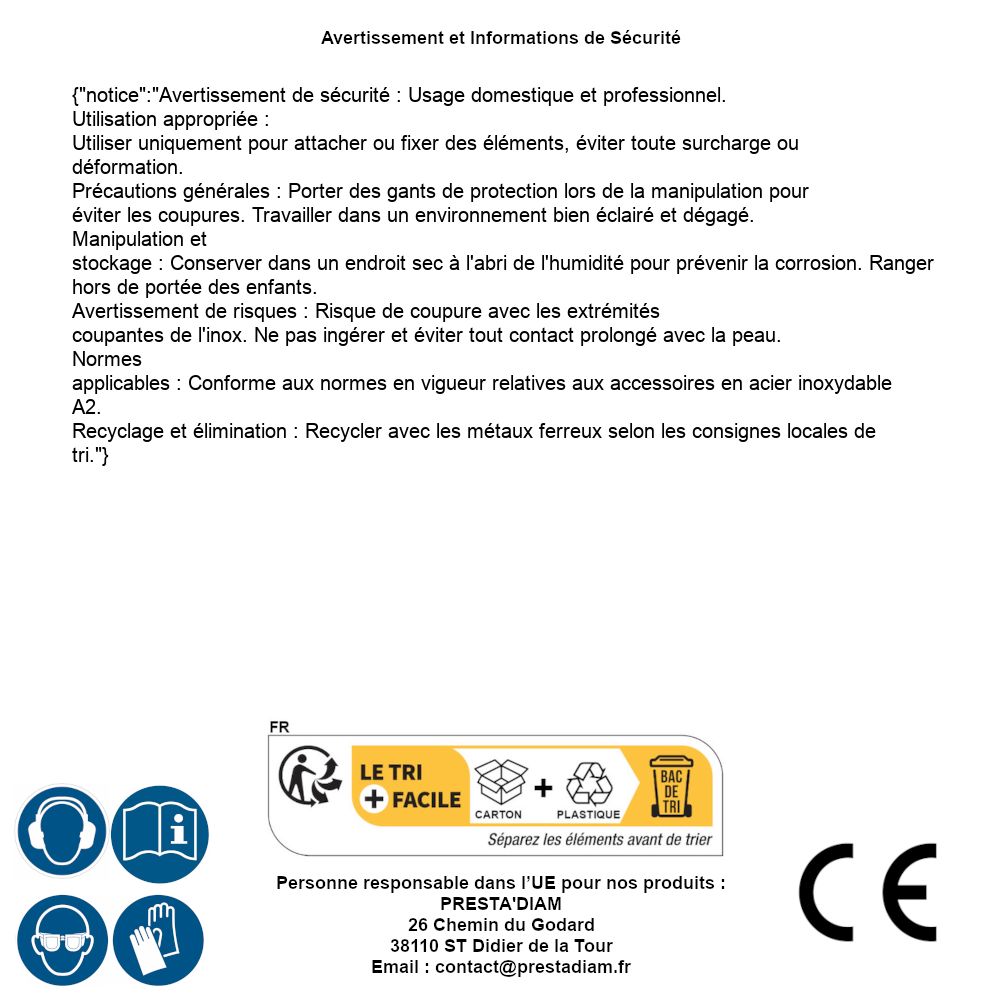 | Persona responsable UE | PRESTA'DIAM 26 Chemin du Godard 38110 ST Didier de la Tour Correo electrónico : contact@prestadiam.fr |