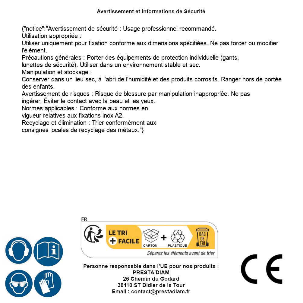 | ADVERTENCIA y SEGURIDAD | Identification de la personne responsable dans l’UE : Nom : PRESTA'DIAM. Adresse : 26 Chemin du Godard, 38110 ST Didier de la Tour (France). Email : contact@prestadiam.fr. |