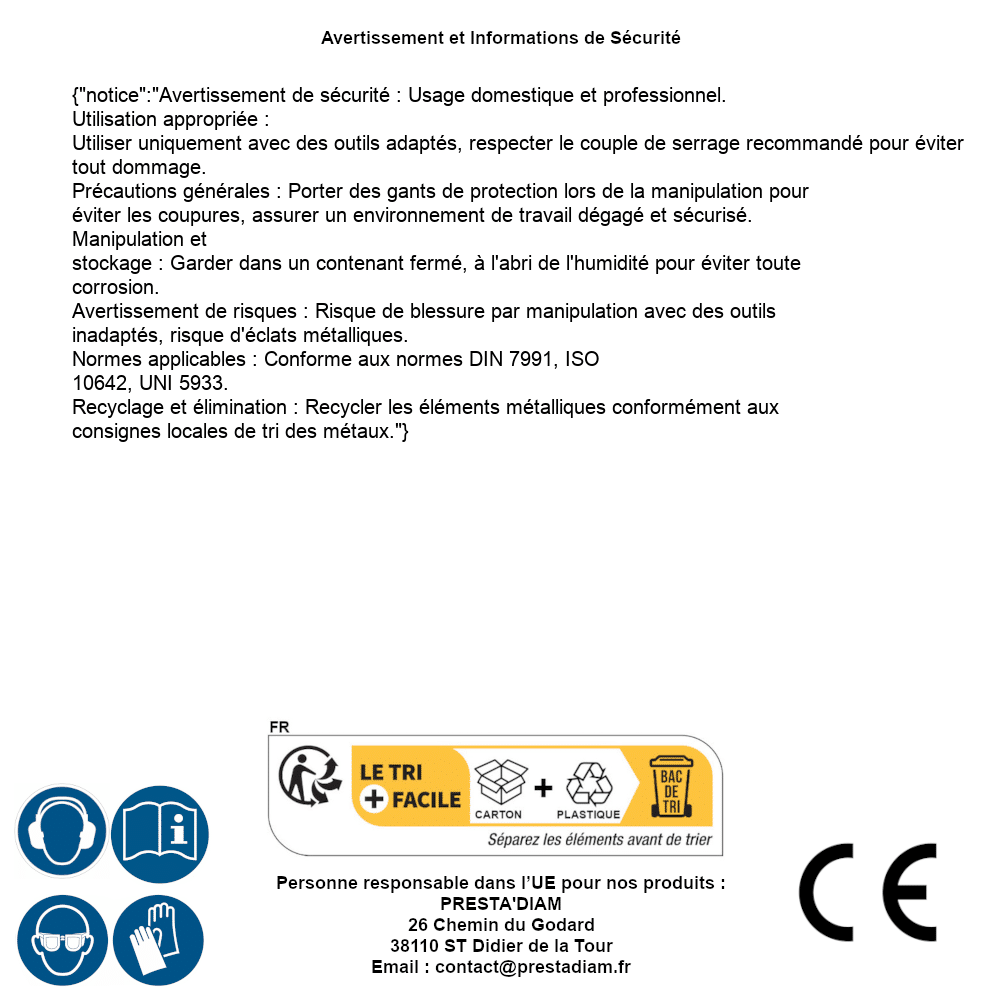 | Persona responsable UE | PRESTA'DIAM 26 Chemin du Godard 38110 ST Didier de la Tour Correo electrónico : contact@prestadiam.fr |