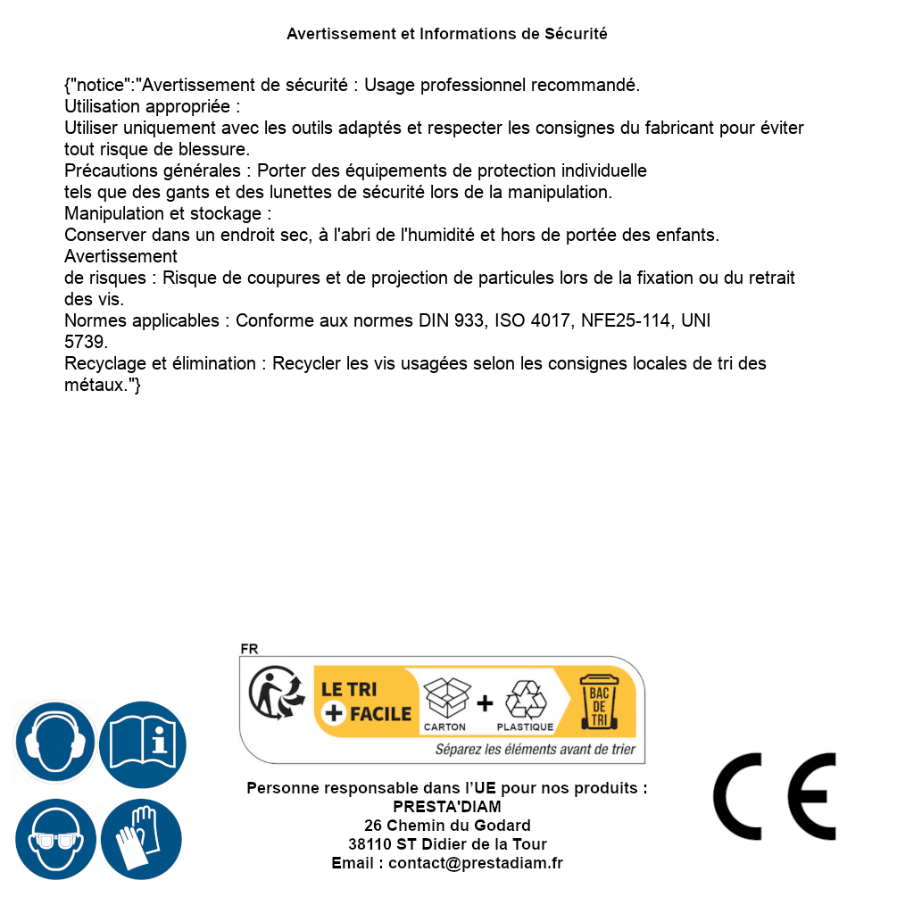 | ADVERTENCIA y SEGURIDAD | Identification de la personne responsable dans l’UE : Nom : PRESTA'DIAM. Adresse : 26 Chemin du Godard, 38110 ST Didier de la Tour (France). Email : contact@prestadiam.fr. |