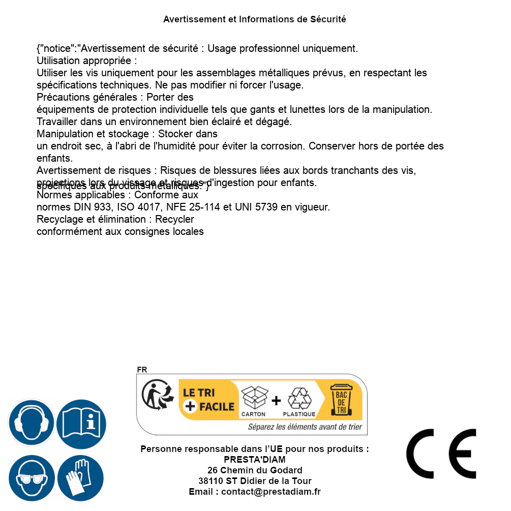 | ADVERTENCIA y SEGURIDAD | Identification de la personne responsable dans l’UE : Nom : PRESTA'DIAM. Adresse : 26 Chemin du Godard, 38110 ST Didier de la Tour (France). Email : contact@prestadiam.fr. |