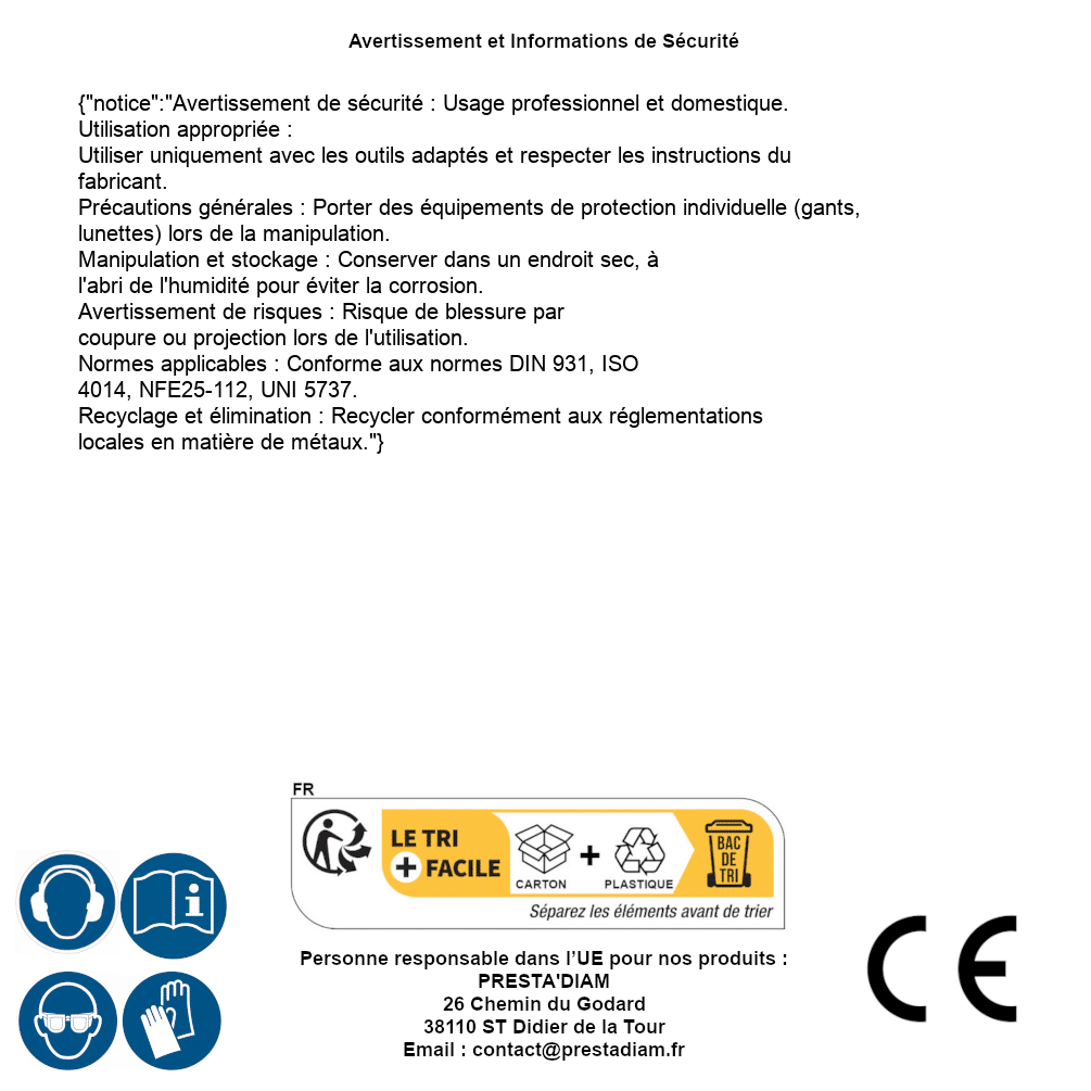 | ADVERTENCIA y SEGURIDAD | Identification de la personne responsable dans l’UE : Nom : PRESTA'DIAM. Adresse : 26 Chemin du Godard, 38110 ST Didier de la Tour (France). Email : contact@prestadiam.fr. |