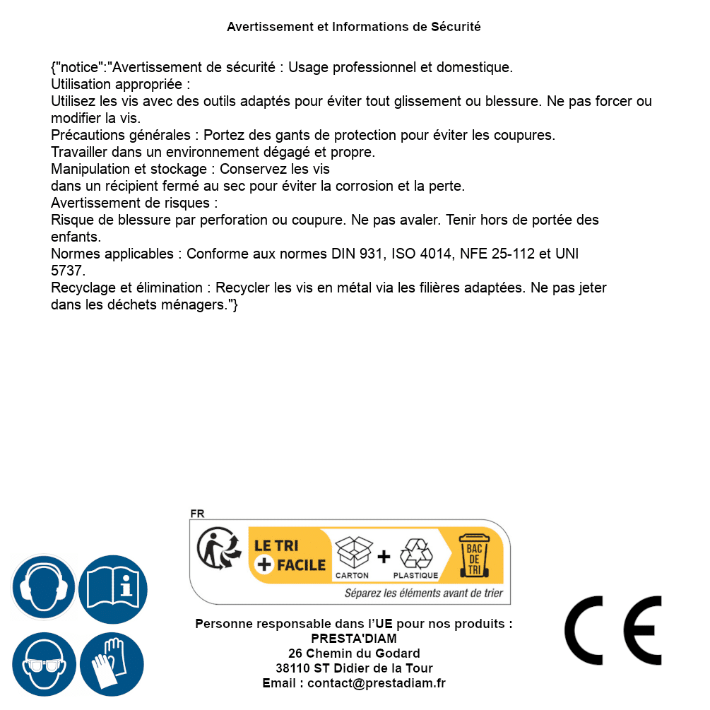 | ADVERTENCIA y SEGURIDAD | Identification de la personne responsable dans l’UE : Nom : PRESTA'DIAM. Adresse : 26 Chemin du Godard, 38110 ST Didier de la Tour (France). Email : contact@prestadiam.fr. |