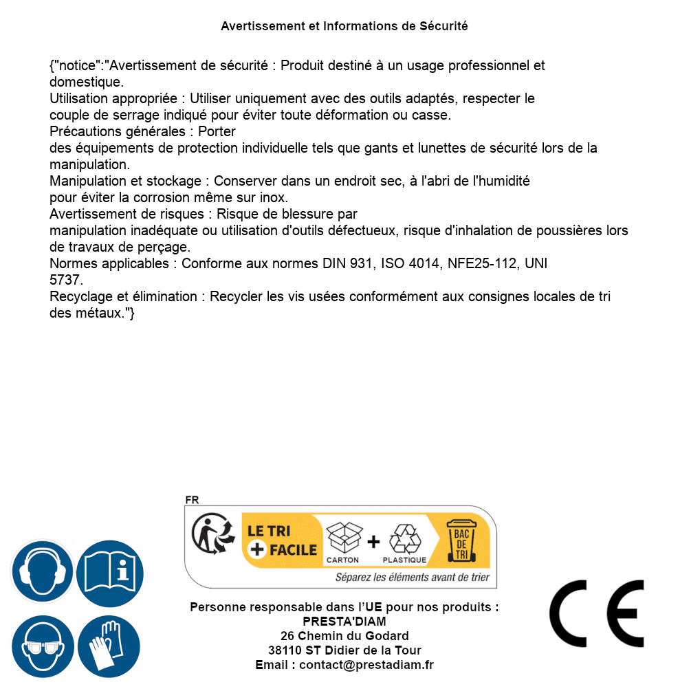 | ADVERTENCIA y SEGURIDAD | Identification de la personne responsable dans l’UE : Nom : PRESTA'DIAM. Adresse : 26 Chemin du Godard, 38110 ST Didier de la Tour (France). Email : contact@prestadiam.fr. |