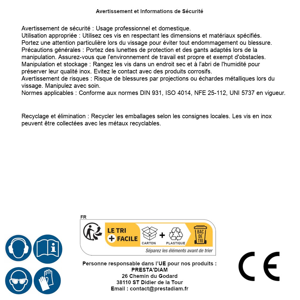 | ADVERTENCIA y SEGURIDAD | Identification de la personne responsable dans l’UE : Nom : PRESTA'DIAM. Adresse : 26 Chemin du Godard, 38110 ST Didier de la Tour (France). Email : contact@prestadiam.fr. |
