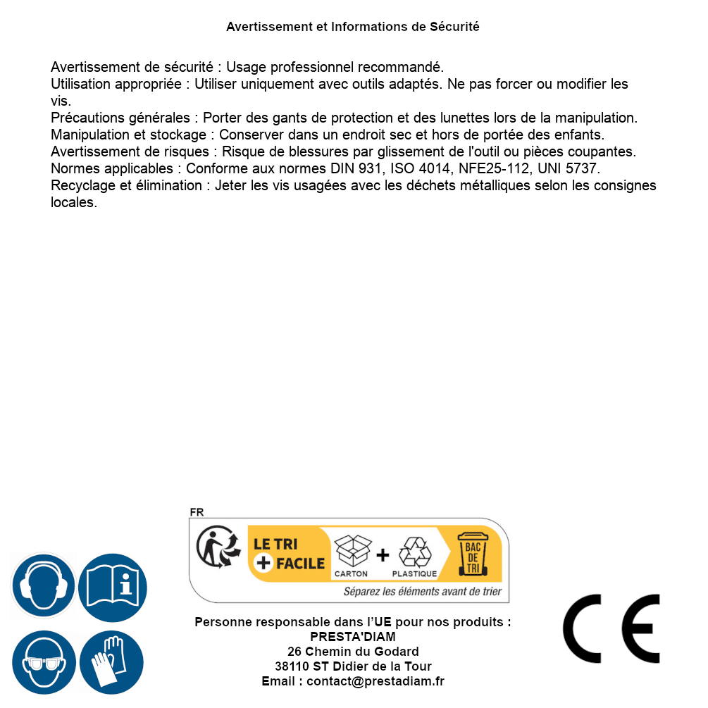 | ADVERTENCIA y SEGURIDAD | Identification de la personne responsable dans l’UE : Nom : PRESTA'DIAM. Adresse : 26 Chemin du Godard, 38110 ST Didier de la Tour (France). Email : contact@prestadiam.fr. |