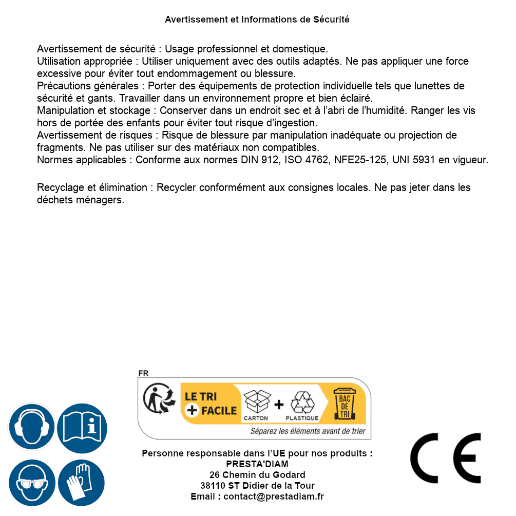 | ADVERTENCIA y SEGURIDAD | Identification de la personne responsable dans l’UE : Nom : PRESTA'DIAM. Adresse : 26 Chemin du Godard, 38110 ST Didier de la Tour (France). Email : contact@prestadiam.fr. |