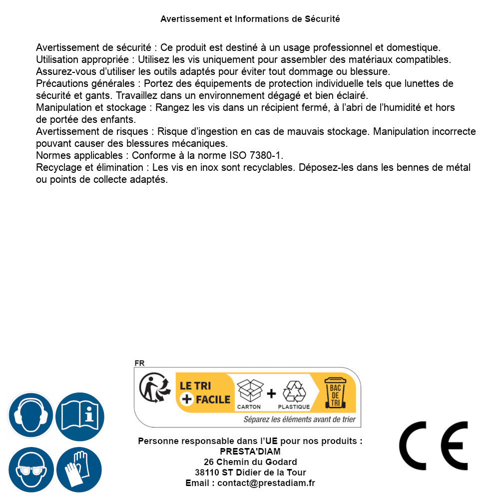 | ADVERTENCIA y SEGURIDAD | Identification de la personne responsable dans l’UE : Nom : PRESTA'DIAM. Adresse : 26 Chemin du Godard, 38110 ST Didier de la Tour (France). Email : contact@prestadiam.fr. |