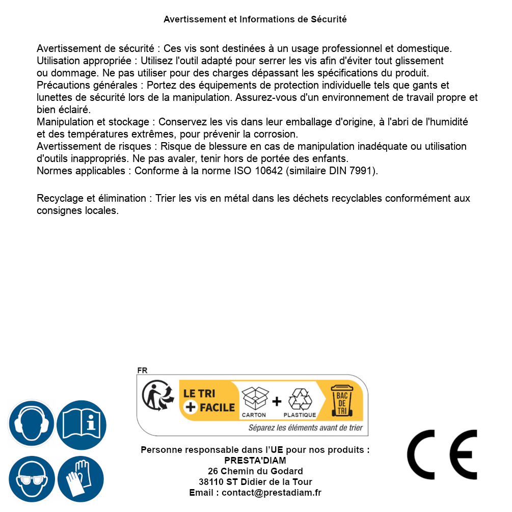 | ADVERTENCIA y SEGURIDAD | Identification de la personne responsable dans l’UE : Nom : PRESTA'DIAM. Adresse : 26 Chemin du Godard, 38110 ST Didier de la Tour (France). Email : contact@prestadiam.fr. |