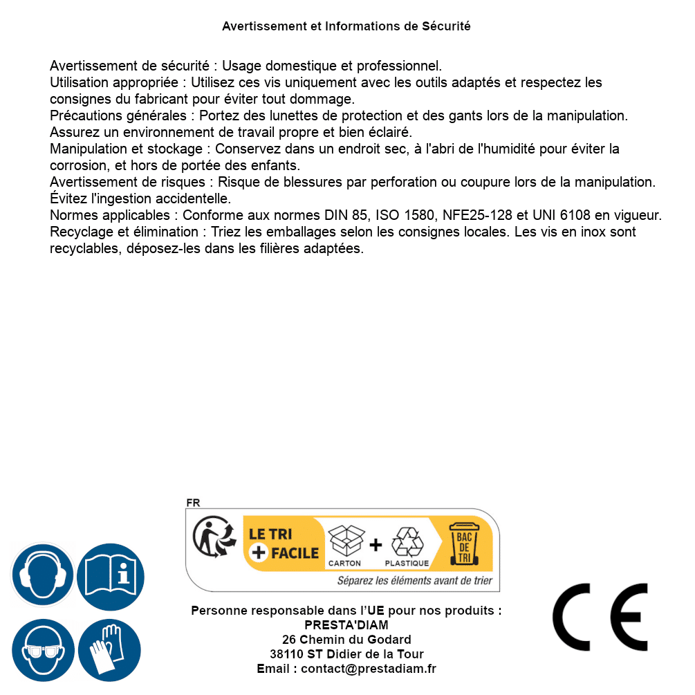 | ADVERTENCIA y SEGURIDAD | Identification de la personne responsable dans l’UE : Nom : PRESTA'DIAM. Adresse : 26 Chemin du Godard, 38110 ST Didier de la Tour (France). Email : contact@prestadiam.fr. |