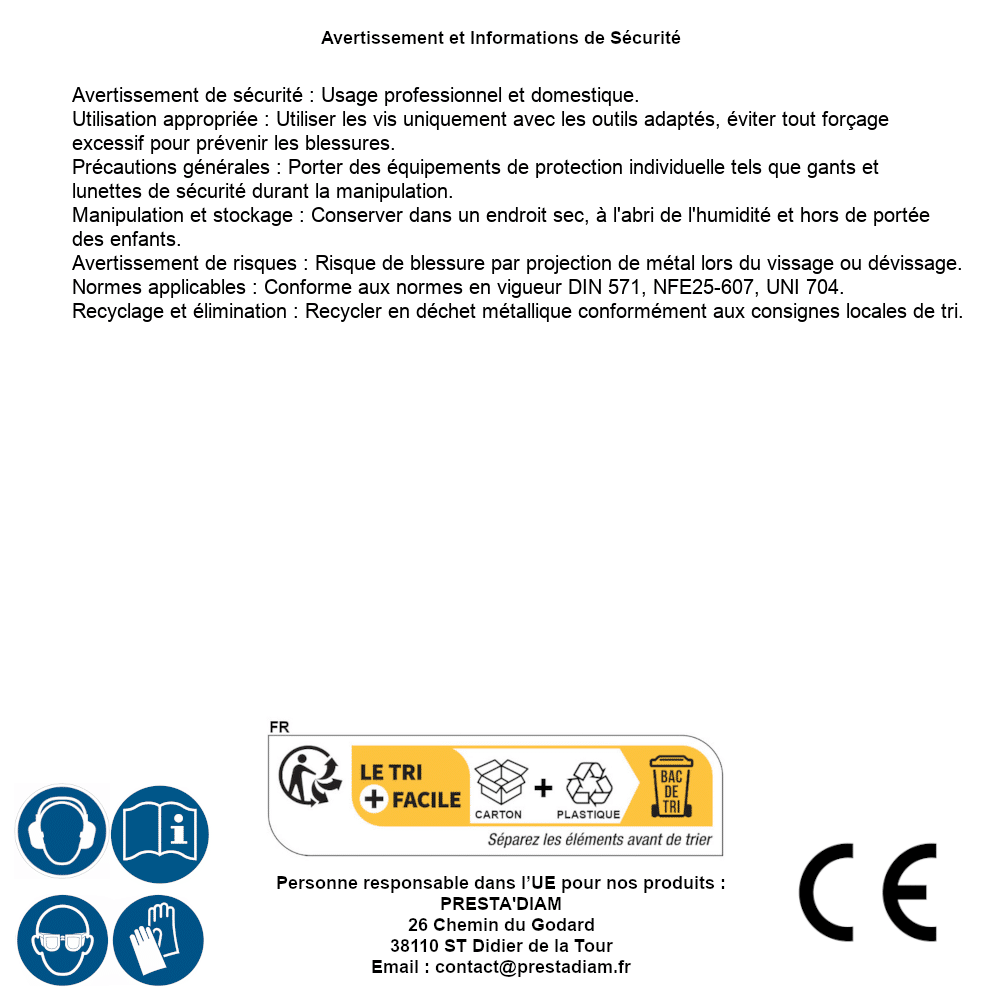 | ADVERTENCIA y SEGURIDAD | Identification de la personne responsable dans l’UE : Nom : PRESTA'DIAM. Adresse : 26 Chemin du Godard, 38110 ST Didier de la Tour (France). Email : contact@prestadiam.fr. |