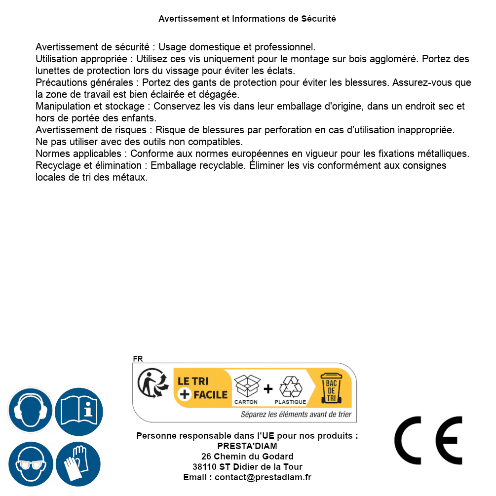 | Persona responsable UE | PRESTA'DIAM 26 Chemin du Godard 38110 ST Didier de la Tour Correo electrónico : contact@prestadiam.fr |