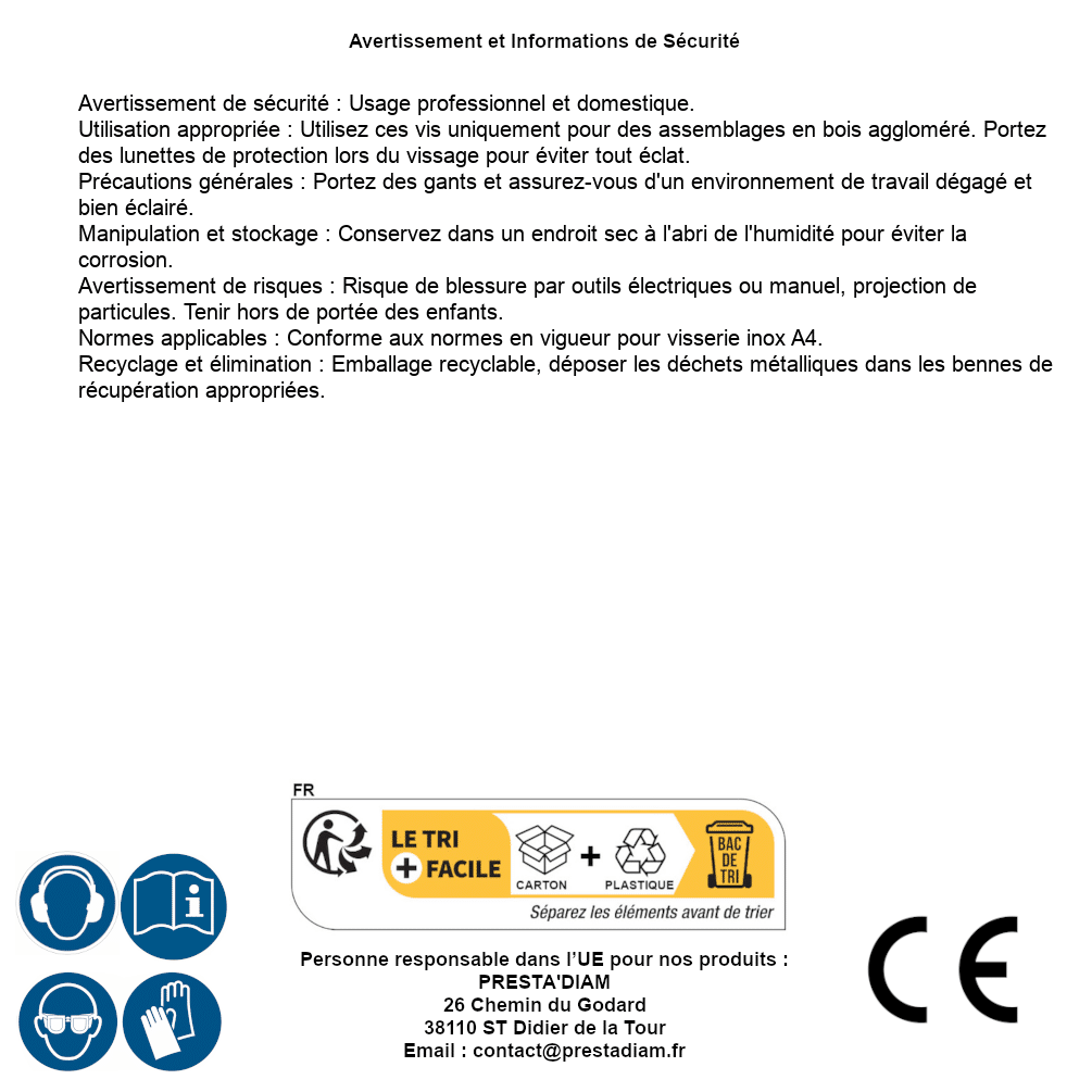 | ADVERTENCIA y SEGURIDAD | Identification de la personne responsable dans l’UE : Nom : PRESTA'DIAM. Adresse : 26 Chemin du Godard, 38110 ST Didier de la Tour (France). Email : contact@prestadiam.fr. |
