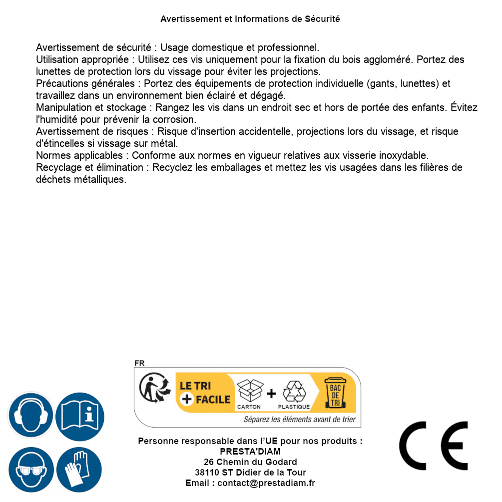 | ADVERTENCIA y SEGURIDAD | Identification de la personne responsable dans l’UE : Nom : PRESTA'DIAM. Adresse : 26 Chemin du Godard, 38110 ST Didier de la Tour (France). Email : contact@prestadiam.fr. |