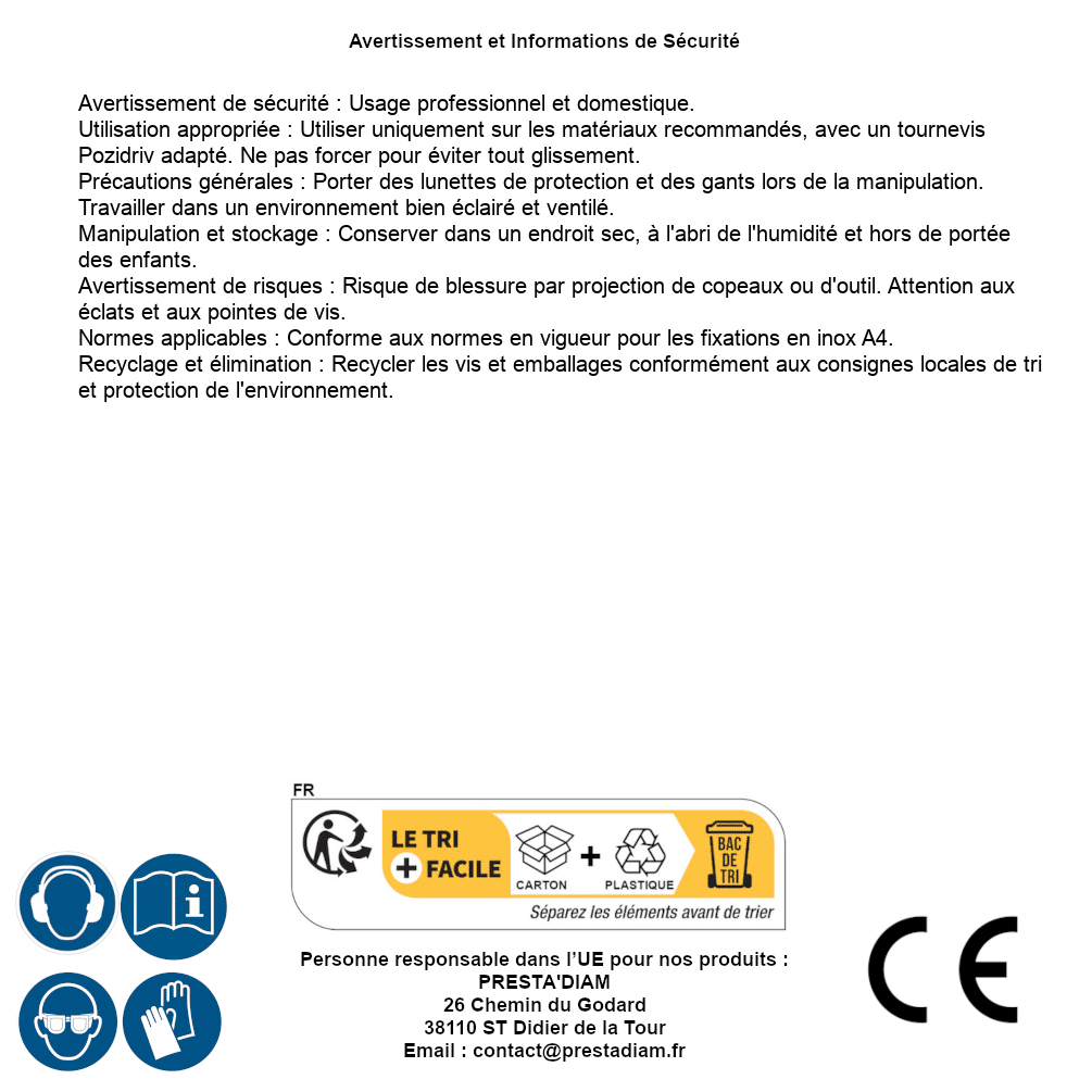 | ADVERTENCIA y SEGURIDAD | Identification de la personne responsable dans l’UE : Nom : PRESTA'DIAM. Adresse : 26 Chemin du Godard, 38110 ST Didier de la Tour (France). Email : contact@prestadiam.fr. |