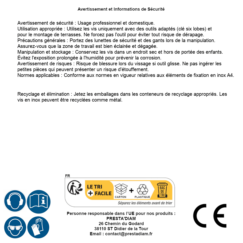 | ADVERTENCIA y SEGURIDAD | Identification de la personne responsable dans l’UE : Nom : PRESTA'DIAM. Adresse : 26 Chemin du Godard, 38110 ST Didier de la Tour (France). Email : contact@prestadiam.fr. |