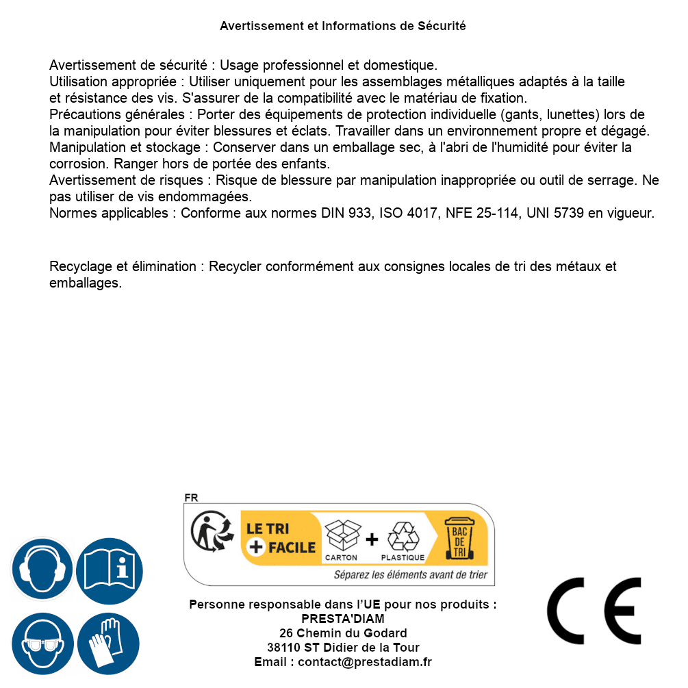| ADVERTENCIA y SEGURIDAD | Identification de la personne responsable dans l’UE : Nom : PRESTA'DIAM. Adresse : 26 Chemin du Godard, 38110 ST Didier de la Tour (France). Email : contact@prestadiam.fr. |