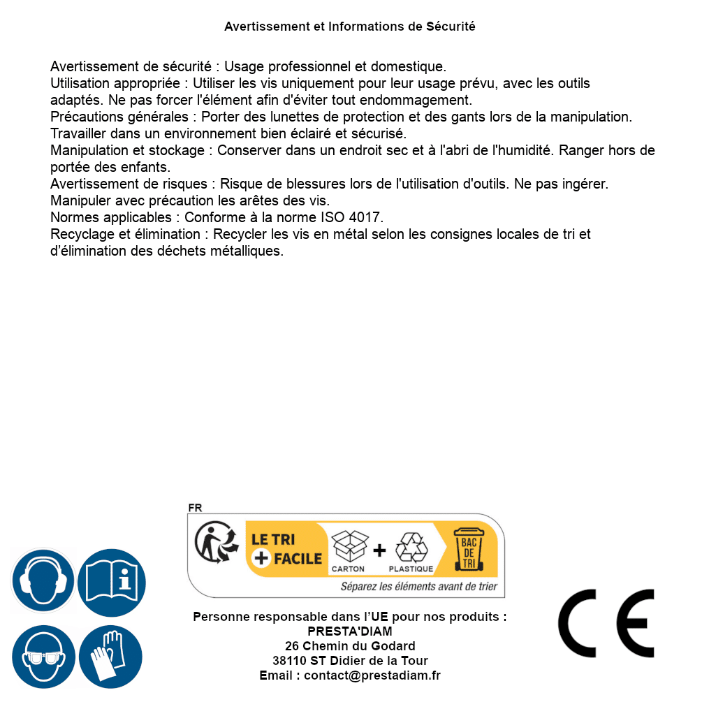 | ADVERTENCIA y SEGURIDAD | Identification de la personne responsable dans l’UE : Nom : PRESTA'DIAM. Adresse : 26 Chemin du Godard, 38110 ST Didier de la Tour (France). Email : contact@prestadiam.fr. |