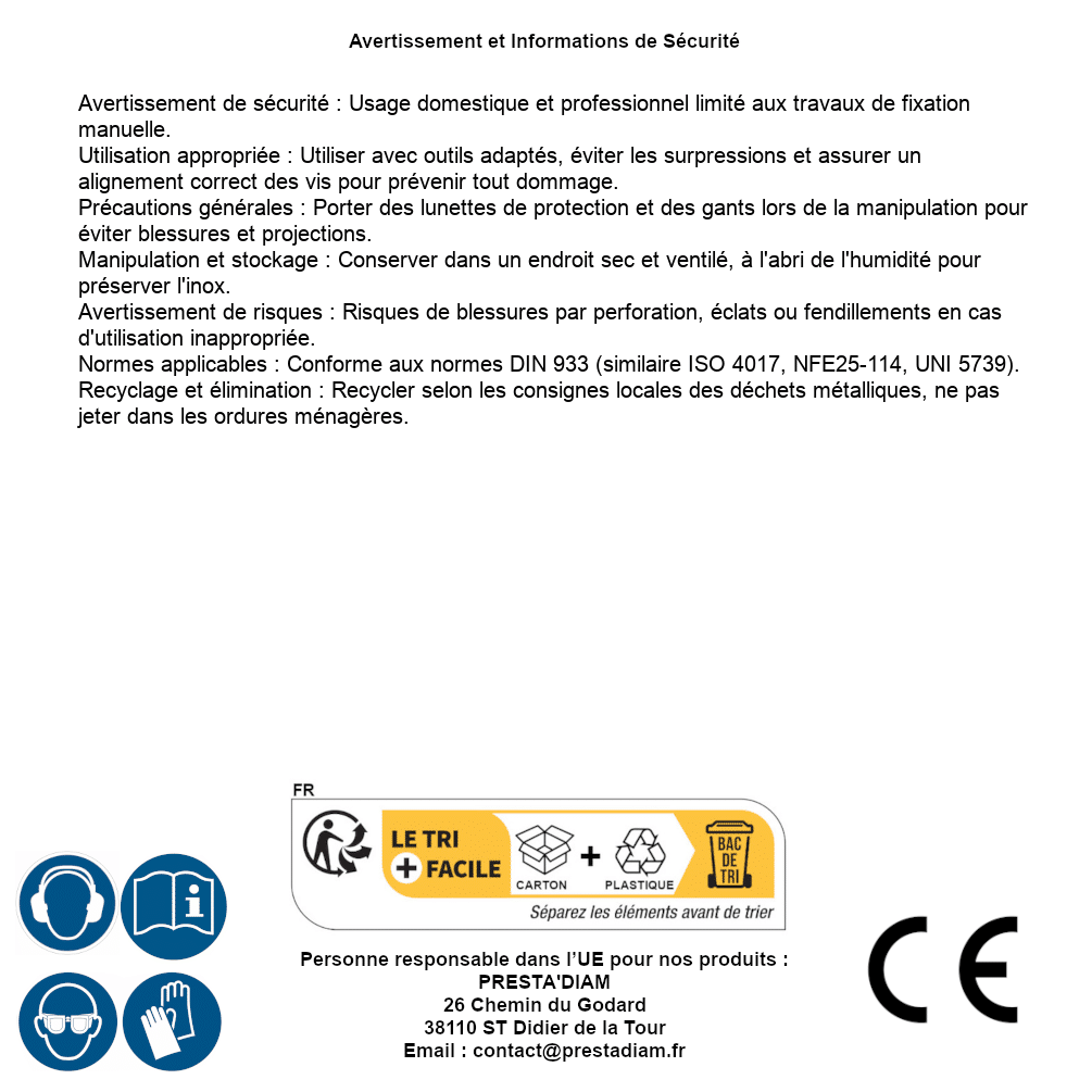 | ADVERTENCIA y SEGURIDAD | Identification de la personne responsable dans l’UE : Nom : PRESTA'DIAM. Adresse : 26 Chemin du Godard, 38110 ST Didier de la Tour (France). Email : contact@prestadiam.fr. |