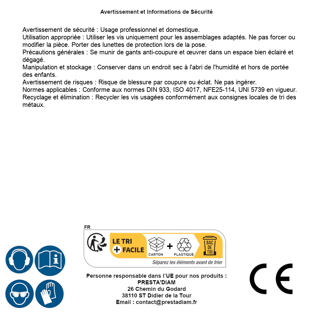 | ADVERTENCIA y SEGURIDAD | Identification de la personne responsable dans l’UE : Nom : PRESTA'DIAM. Adresse : 26 Chemin du Godard, 38110 ST Didier de la Tour (France). Email : contact@prestadiam.fr. |