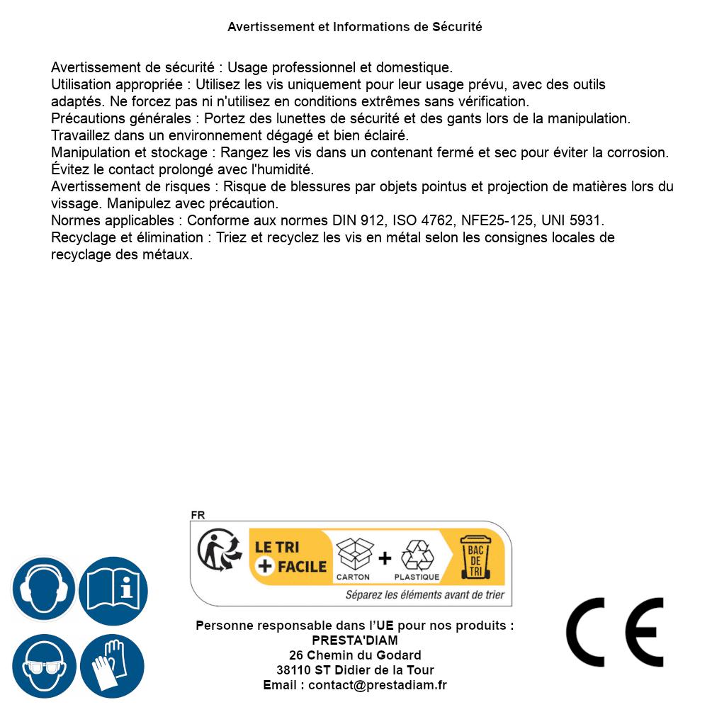 | ADVERTENCIA y SEGURIDAD | Identification de la personne responsable dans l’UE : Nom : PRESTA'DIAM. Adresse : 26 Chemin du Godard, 38110 ST Didier de la Tour (France). Email : contact@prestadiam.fr. |