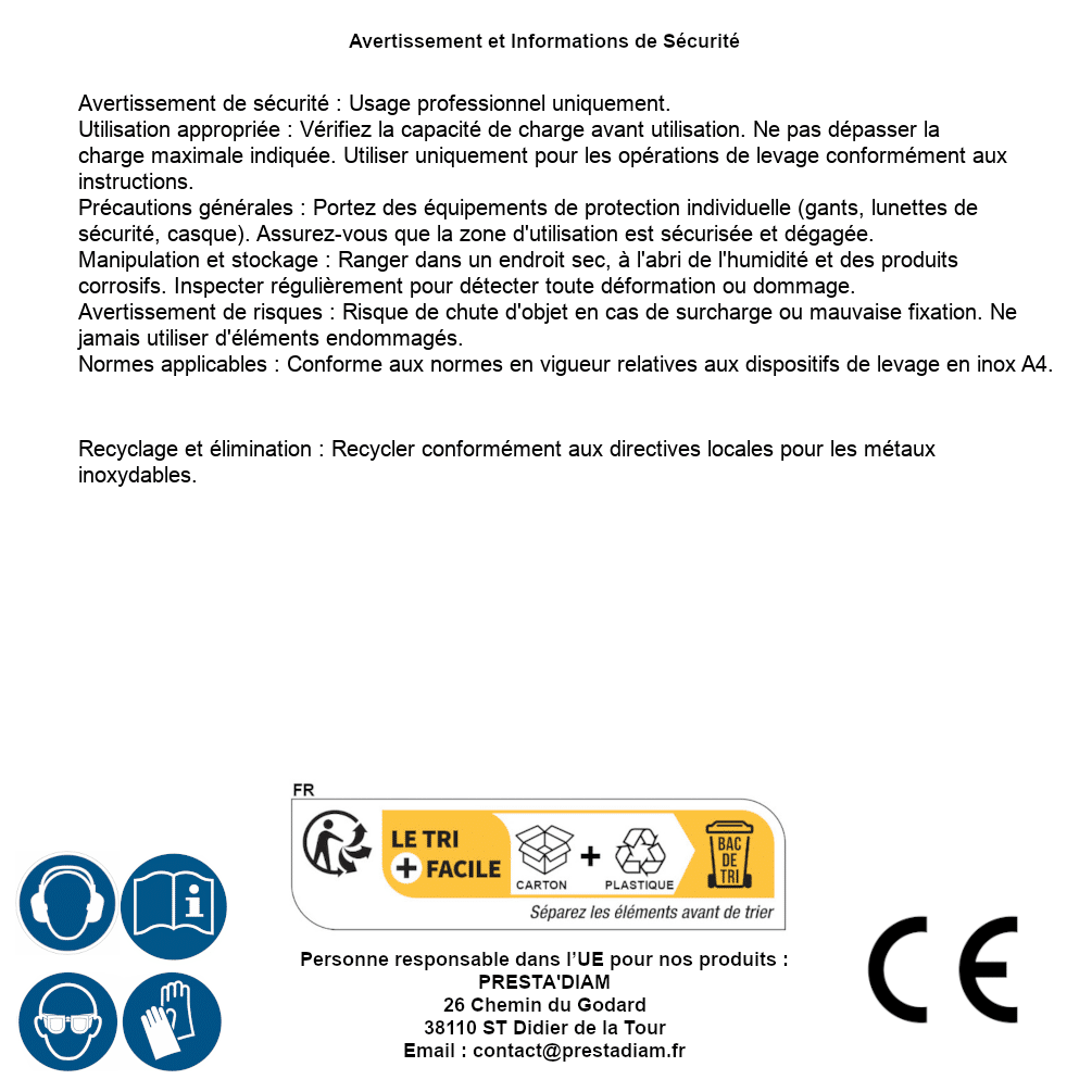 | ADVERTENCIA y SEGURIDAD | Identification de la personne responsable dans l’UE : Nom : PRESTA'DIAM. Adresse : 26 Chemin du Godard, 38110 ST Didier de la Tour (France). Email : contact@prestadiam.fr. |