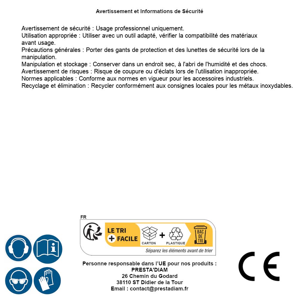 | ADVERTENCIA y SEGURIDAD | Identification de la personne responsable dans l’UE : Nom : PRESTA'DIAM. Adresse : 26 Chemin du Godard, 38110 ST Didier de la Tour (France). Email : contact@prestadiam.fr. |