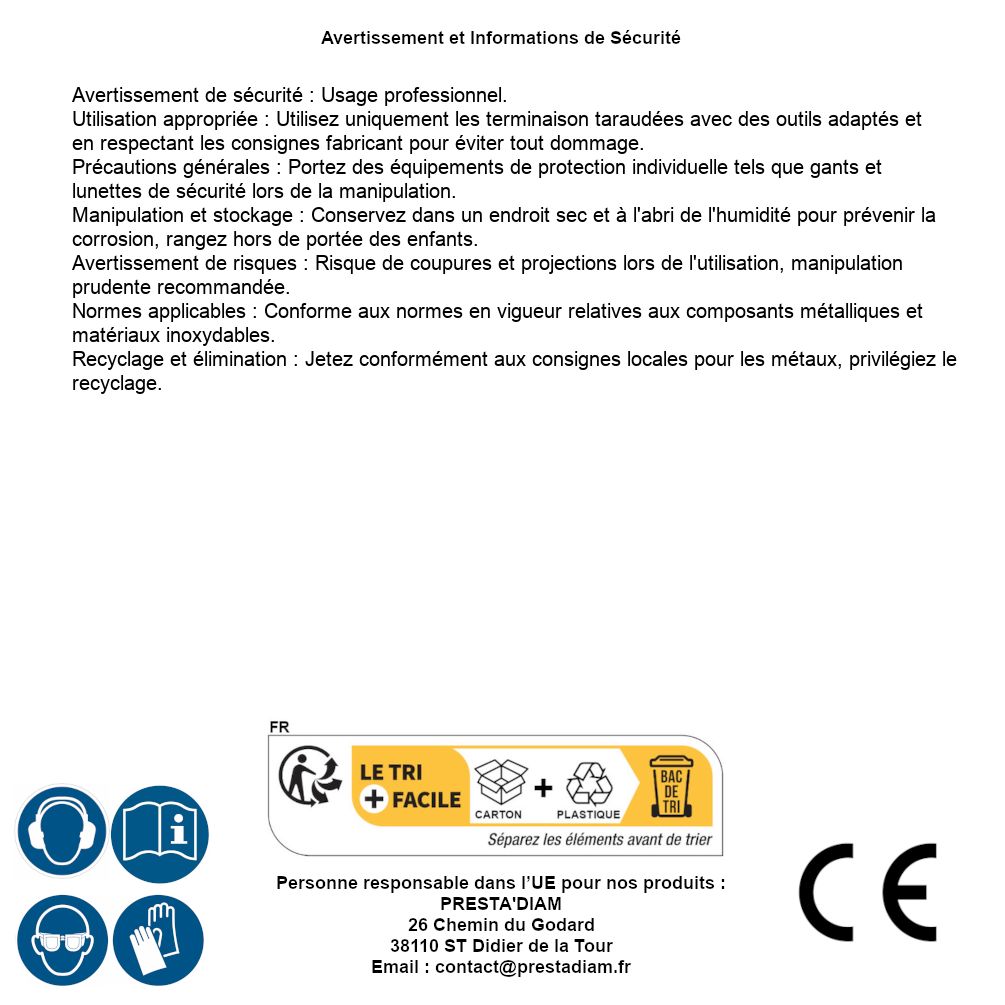 | ADVERTENCIA y SEGURIDAD | Identification de la personne responsable dans l’UE : Nom : PRESTA'DIAM. Adresse : 26 Chemin du Godard, 38110 ST Didier de la Tour (France). Email : contact@prestadiam.fr. |