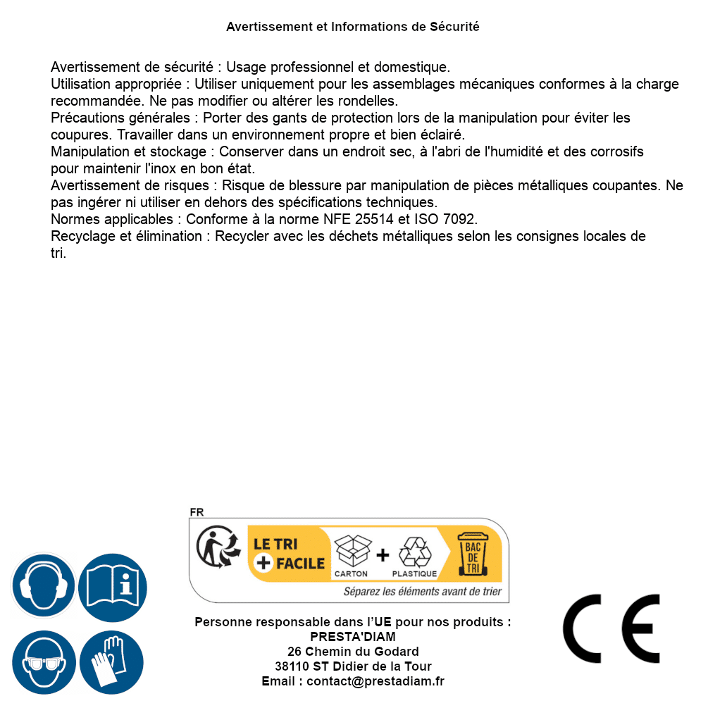 | ADVERTENCIA y SEGURIDAD | Identification de la personne responsable dans l’UE : Nom : PRESTA'DIAM. Adresse : 26 Chemin du Godard, 38110 ST Didier de la Tour (France). Email : contact@prestadiam.fr. |