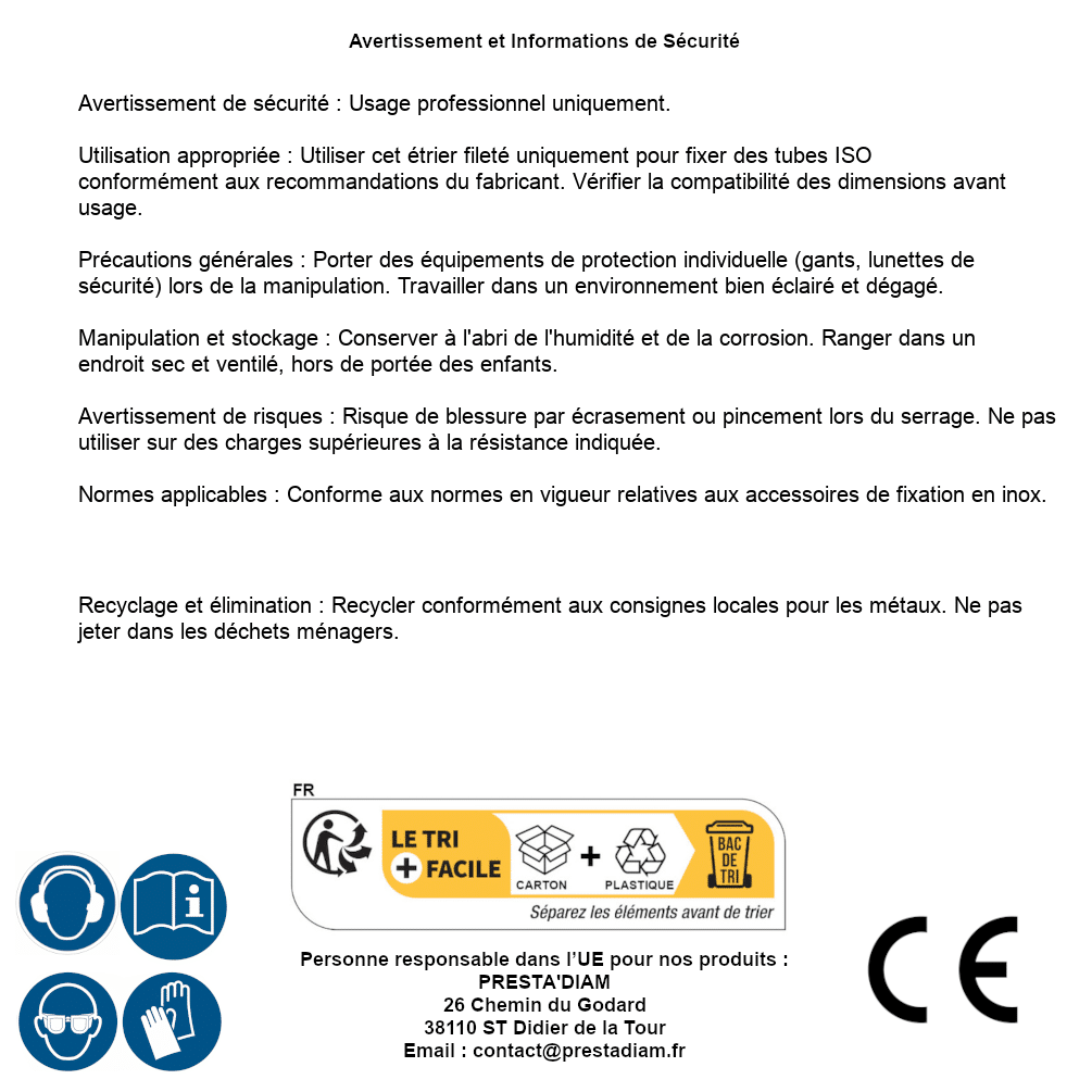 | ADVERTENCIA y SEGURIDAD | Identification de la personne responsable dans l’UE : Nom : PRESTA'DIAM. Adresse : 26 Chemin du Godard, 38110 ST Didier de la Tour (France). Email : contact@prestadiam.fr. |