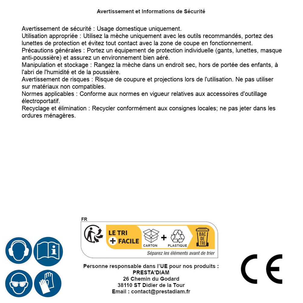 | Persona responsable UE | PRESTA'DIAM 26 Chemin du Godard 38110 ST Didier de la Tour Correo electrónico : contact@prestadiam.fr |